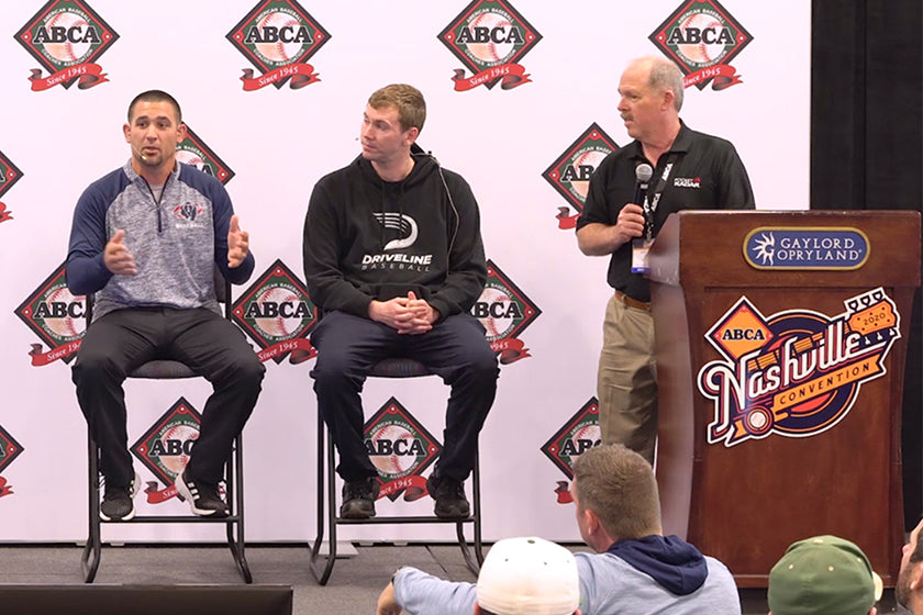 CEO, Steve Goody, moderates the 2020 ABCA Expo Theater presentation which featured presenters: Ben Buechner (Santa Rosa Junior College) and Max Engelbrekt (Driveline Baseball).